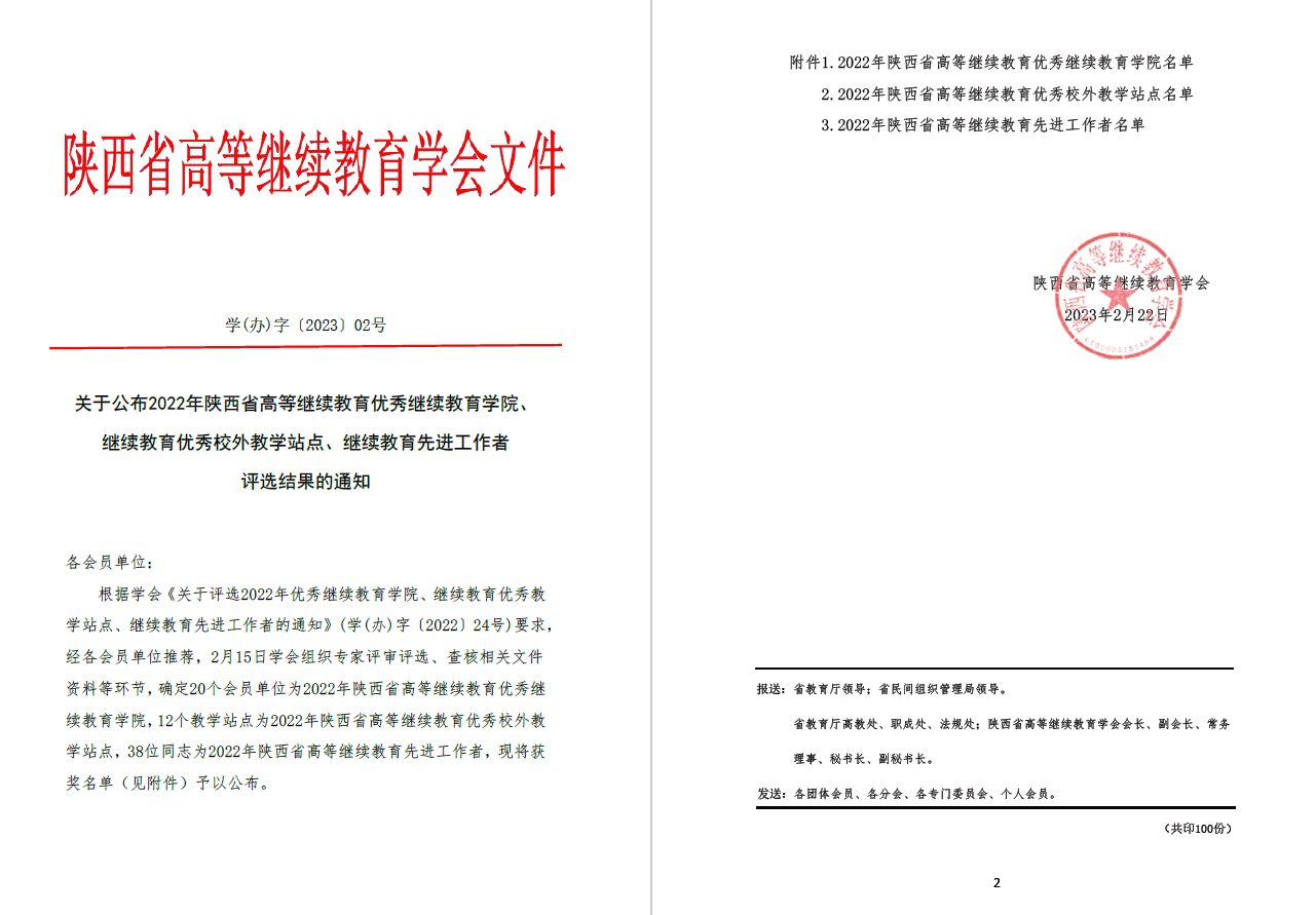 2023年2月23日,陕西省高等继续教育学会发布《关于公布2022年陕西省高等继续教育优秀英国365公司官网、继续教育优秀校外教学点、继续教育先进工作者评选结果的通知》,英国365公司官网荣获2022年陕西省高等继续教育优秀公司,惠震获2022年陕西省高等继续教育先进工作者。