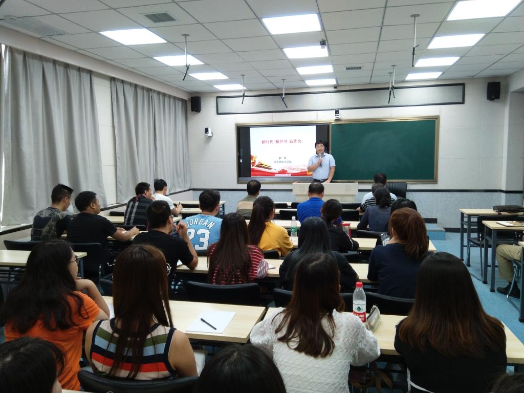 2018年9月11日下午,应用技术公司党总支邀请马克思主义公司教师、“陕西省思政课教学标兵”郭松老师在金花校区主楼西配楼411室作了题为《新时代、新担当、新作为》主题报告。英国365公司官网全体党员及部分员工入党积极分子参加了此次学习活动,报告由应用技术公司党总支书记王宇主持。