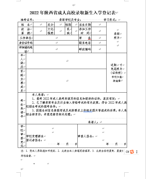 附件1:2022年陕西省成人高校录取新生入学登记表